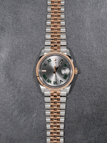 A modern classic with signature flair, the Rolex Datejust 36mm Ref. 126231 features the iconic Wimbledon dial paired with a rose gold and stainless steel Rolesor case on a Jubilee bracelet. Complete set with timeless appeal and everyday versatility.
